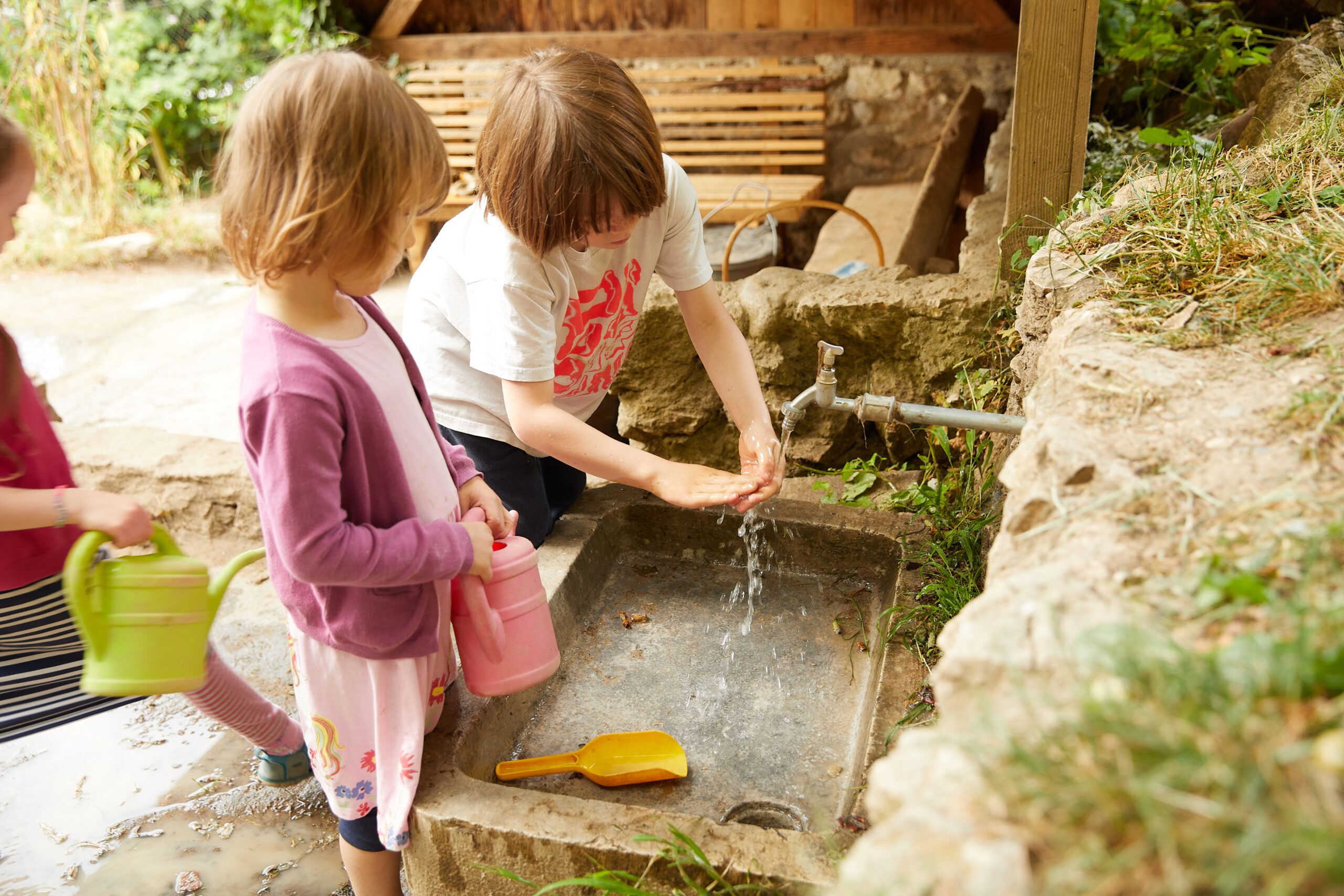 Reiche und echte Sinneserlebnisse verbinden die Kinder mit der Welt und lassen sie im eigenen Körper ein Zuhause finden. Ob im Haus, Garten, oder Wald können sie die Umgebung durch Spielen und Tätigsein mit allen Sinnen erforschen.